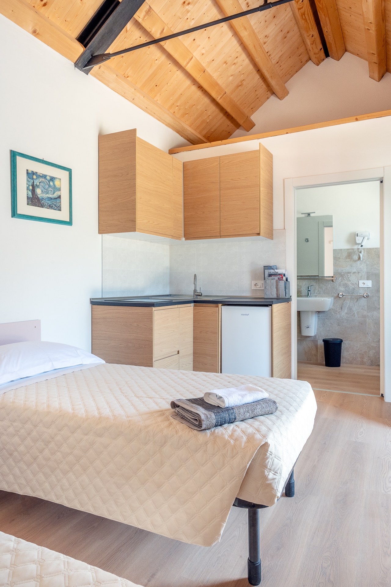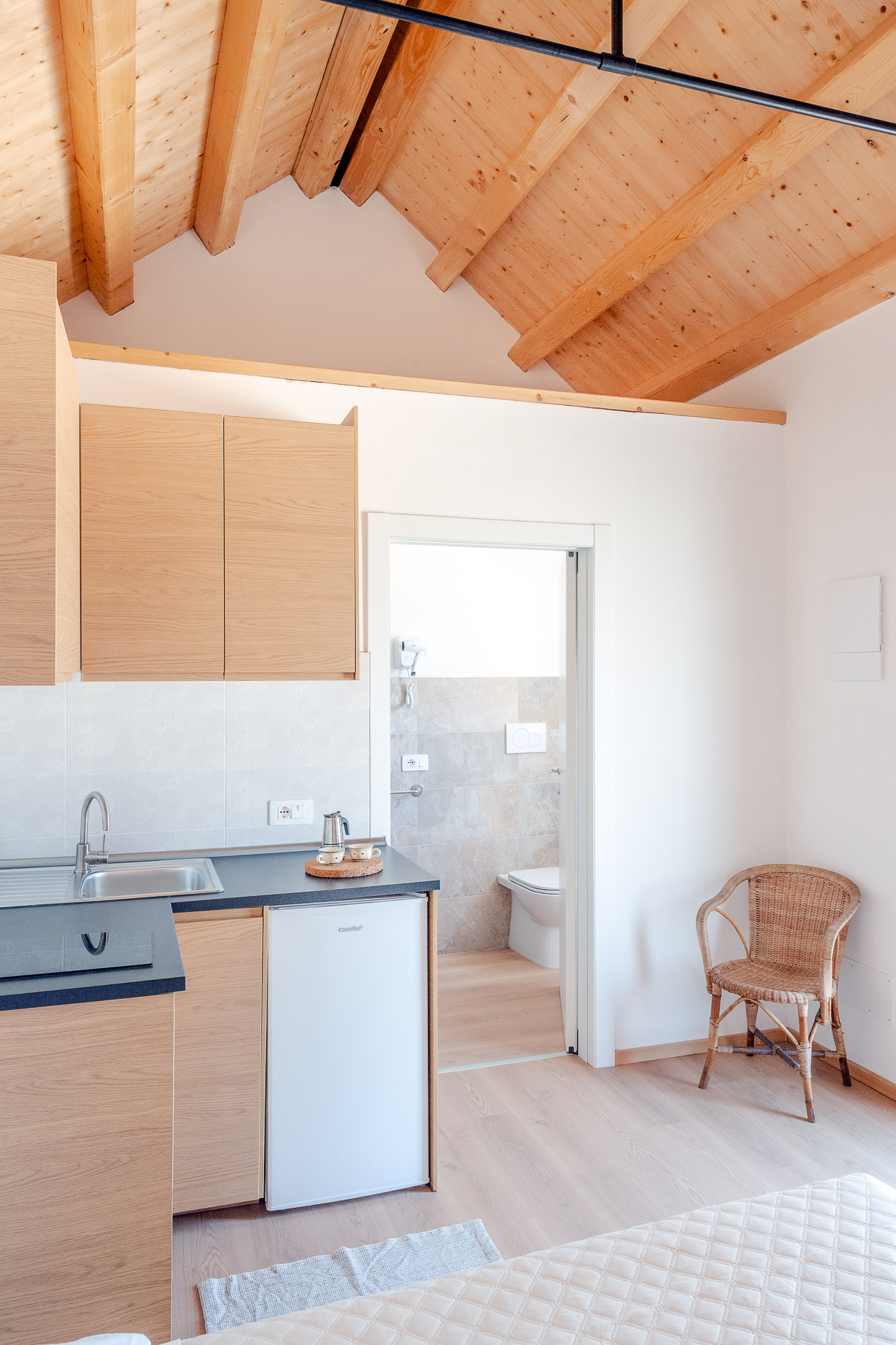 L’angolo cottura dispone di un piano cottura ad induzione, un forno a microonde, un frigo e viene messo a disposizione completo di biancheria da letto e da cucina, pentole e stoviglie.